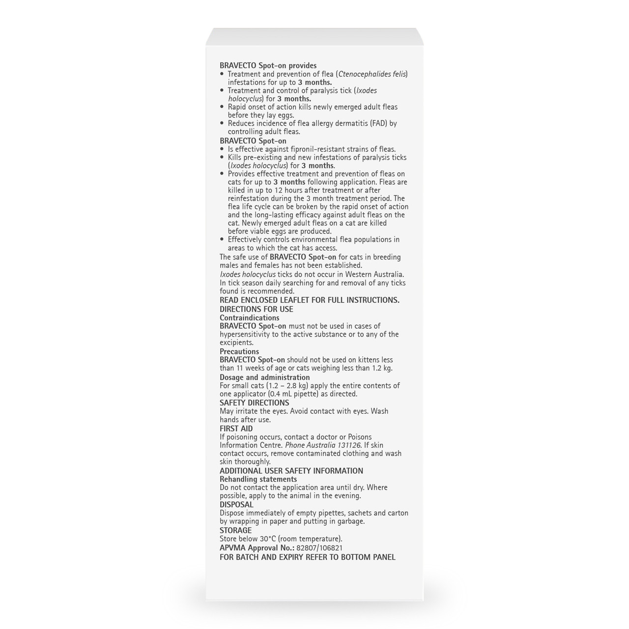 Introducing Bravecto Spot-On for Cats, a long-lasting solution designed to effectively treat and control fleas and ticks for up to 3 months. With its active ingredient, Fluralaner (280 mg/mL), this powerful treatment provides fast-acting relief from flea infestations while also helping to prevent future occurrences. Ideal for cat owners looking for a reliable way to keep their pets flea-free, Bravecto Spot-On is the go-to choice for extended protection.